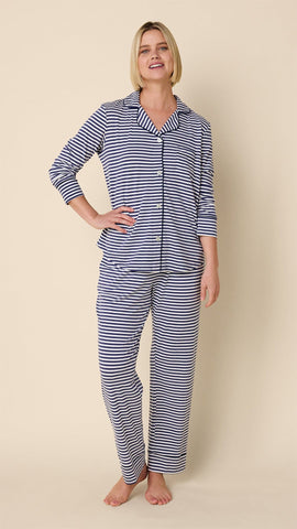 We searched the globe for the perfect knit fabric for our pajamas. Hand-pulled Peruvian Pima cotton was the ideal starting point, prized for its silky luster and soft texture. To achieve the ultimate balance, we blended it with modal for a flattering drape and added a touch of spandex for just the right amount of stretch and recovery, ensuring they move beautifully with you. The result is a decadent pajama set made for lounging in absolute comfort.